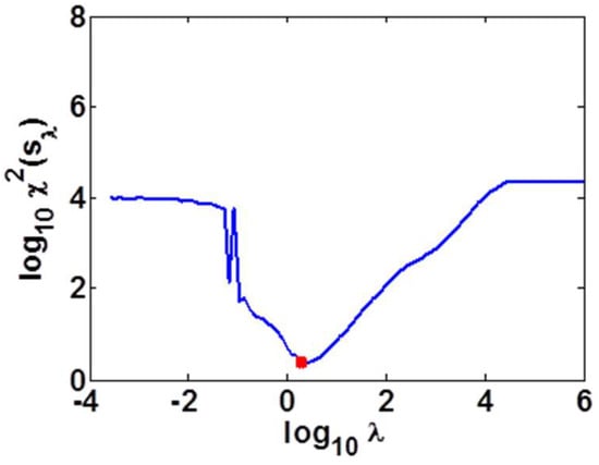 To choose the optimal L1 regularization parameter, we computed the residual for different regularization parameters, where is the solution of the objective function with the regularization parameter . The corresponding with the minimum residual is considered as the optimal solution of Equation (A10), thus the corresponding is the optimal L1 regularization parameter.