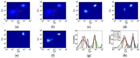 Inverted T1–T2 spectra, T1 spectra and T2 spectra in heavy oil reservoirs with different regularization parameters. (a–f) represent the inverted T1–T2 spectra with regularization parameters of 0.01, 0.1, 10, 100, 1000 and 1.9156, respectively (g,h) represent the T2 and T1 spectra from the T1–T2 spectra projections onto the T2 and T1 axes, respectively.