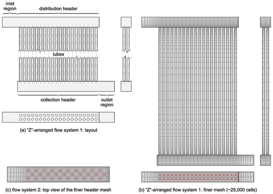 Three different flow systems, with both the “U” and the “Z” flow arrangements (“U”: outlet on the same side of the flow system as the inlet, “Z”: outlet on the opposite side), were used to generate test cases. Moreover, in two of these three flow systems, the mesh fineness was also varied (coarser and finer mesh). This yielded ten flow system configurations in total, with simplified, cuboid cell-only meshes of different sizes ranging from ~6000 cells to ~41,000 cells (see