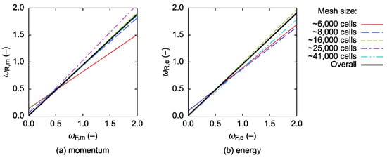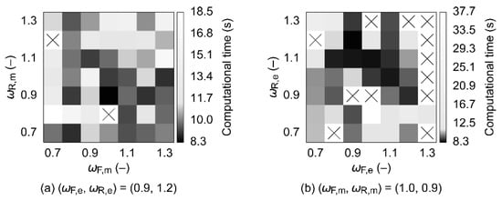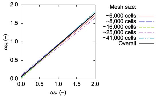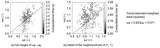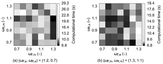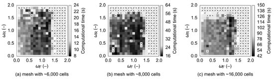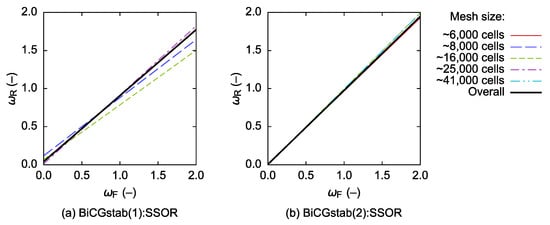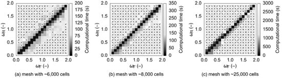 The SSOR-preconditioned numerical solution methods were tested with various tuples of ωF, ωR = 0.1, 0.2, …, 1.8, 1.9 in successive steps, depending on the obtained results. Promising combinations of ωF and ωR were then taken as pivots, and their square neighborhoods were tested further—that is, all combinations of ωF, ωR with the respective values being ω – 0.04, ω – 0.02, ω, ω + 0.02, and ω + 0.04 were evaluated except for the original pivot point (ωF, ωR). In order to be able to compare SSOR to the baseline (ILU), all the ten meshes were also evaluated using the ILU-preconditioned combinations of solution methods. In total, 50,620 CFD model setups were tested.