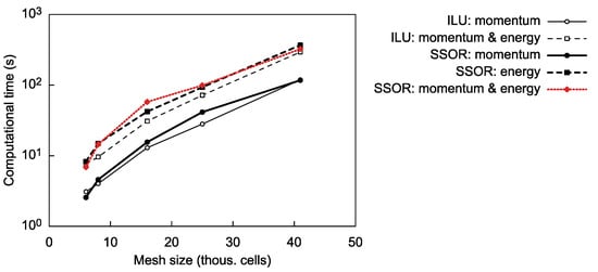 Table 2. The first one concerned the number of CFD solver iterations, while the second one applied to the actual computational time. Any combination of numerical solution methods and preconditioning techniques which exceeded at least one of these two limits was marked as failing to reach a solution. Additionally, since robustness is one of the factors that must be considered when evaluating the suitability of numerical solution methods, no user interventions (e.g., changes to the internal residual limits of the numerical methods, CFD relaxation factors, etc.) were allowed during a solution process.