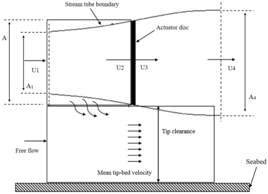 A narrow region is formed between the turbine and seabed when the turbine is close to the seabed. The existence of rotating turbine disturbs the natural water flow by blocking partial water and extracting energy with velocity reduction with a complicated wake downstream and accelerated tip-bed velocity, which is generally called as shadowing effect. The shadowing effect of a tidal turbine is the main influencing factor on tidal turbine scouring. The squeezing process of tip-bed velocity is shown in Figure 2. The tip-bed velocity of this squeezed flow is accelerated by the shadowing effect of tidal turbines [5]. The aforementioned axial momentum theory is combined with the conservation of mass to estimate the tip-bed velocity.