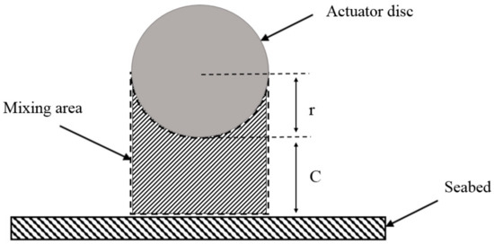 The flow that does not pass through the tidal turbine is spread around due to the shadowing effect of tidal current turbines, as shown in Figure 3. Downward flow is mixed with free flow in the tip-bed region, which leads to an increase in tip-bed velocity compared to the undisturbed free flow. The mass flow coefficient Cm is proposed to present the ratio of Δm1 (flow mass passing through the mixing area) to Δm (the total mass that does not pass through the tidal turbine), as shown in Equation (15). The mixing area is shown in Figure 4. The mass flow coefficient Cm is related to turbine parameters, tip clearance, water depth, turbulence intensity, and seabed conditions. This assumes that the water can flow downward, upward, leftward, and rightward, and 25% of the water is flowing downward into the mixing area. A mass flow coefficient Cm of 0.25 is taken to represent the downward water.