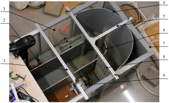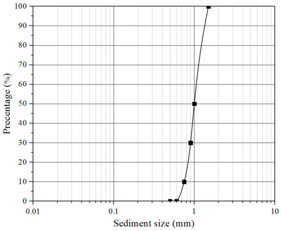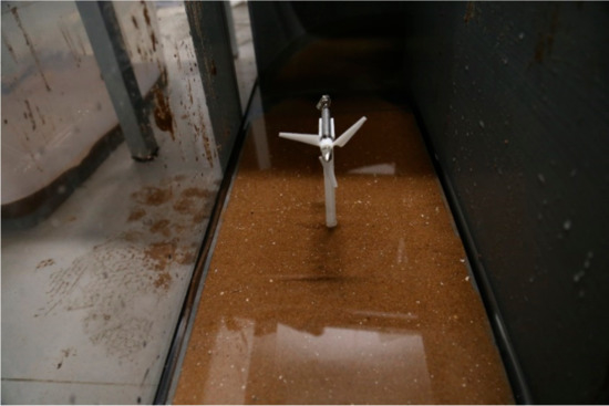 Sediment was filled into a sand box, which was 0.25 m in width, 1 m in length, and 0.1 m in depth, to model the seabed (located at label 9 in Figure 6). The sand box was used to locate the sand at the designated location in the flume bed and was easy to remove after experiments. The upstream and downstream areas of the sandbox had slopes to ensure that the flow passed through the measurement area smoothly. A flat plate was fixed on the head of the sand box. The combination of a slope plate and a flat plate made the flow pass through the test section smoothly in the scouring process. The sand was filled in the box and was levelled by using a sand leveller before the scour experiments. A monopile support structure was embedded into the middle of the sandbed during the tests. Sands with a median particle size of d50 = 1 mm were used in the experiments to keep the scouring condition of clear water, as shown in Figure 8, which ensured that the incoming flow velocity near the seabed (u* ≈ 0.013 m/s) was below the incipient velocity of sediment (uc* ≈ 0.023 m/s for the sediment with a diameter d50 = 1.0 mm. The critical Shields parameter was 0.034).