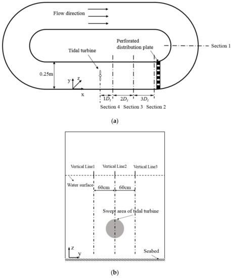 Flow disturbance and perturbation were mainly caused by the water circulation in the channel. The bend of the water channel caused the outer flow (flow close to the outer section) to move faster than the inner flow (flow close to the inner section) due to centrifugal forces. Before the seabed scouring experiment, velocity measurements were carried out at four transverse sections upstream of the turbine (Figure 9), and these were used to investigate the incoming flow structure and its turbulent level.