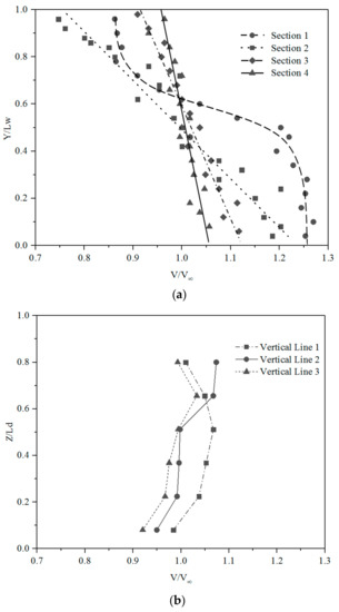 where M is the width of the water channel (m) and d is the width of the square grids on the perforated distribution plate (m). The velocity distributions at the horizontal and vertical sections in the water channel are presented in Figure 10a,b. The velocities in the x-axis are non-dimensionalised by the free flow velocity (V∞). The y-axis in Figure 10a,b represent the distances along the horizontal and vertical sections, respectively, and are non-dimensionalised by the channel depth (Ld) and the channel width (Lw).