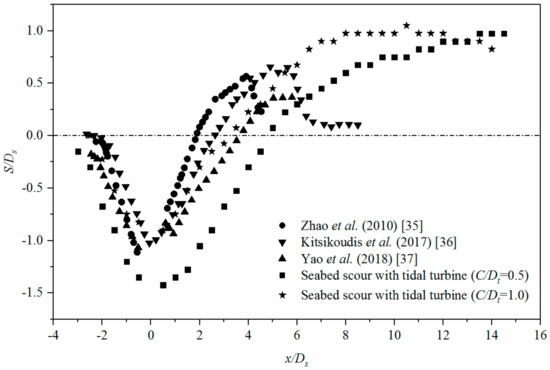 Tidal turbine scouring has an analogous profile and moving trend compared to cylinder scouring, as shown in Figure 11. The maximum scour depth for a tidal turbine with clearances C/Dt = 0.5 and 1.0 was compared to the cylinder scouring experiments by Zhao et al. [35], Kitsikoudis et al. [36], and Yao et al. [37], as listed in Table 4. The monopile-supported tidal turbine scouring was analogous to the single monopile when its turbine was placed at a position with sufficient height. The influence of the rotating turbine was significant to the seabed at a low clearance condition, but it was insignificant for a high clearance. The maximum scour depth for a tidal turbine with a tip clearance of 1.0 Dt was 0.9 Ds, which is close to the cylinder scour depth of 1.11 Ds, 1.0 Ds, and 1.0 Ds found by Zhao et al. [35], Kitsikoudis et al. [36], and Yao et al. [37], respectively. The tidal turbine had a deeper scour pit compared to the cylinder monopile when the tip clearance of the tidal turbine was small, which was 0.5 Dt in the current work. The scouring range of the sand pit caused by the tidal turbine with a tip clearance of 1.0 Dt was almost the same as the cylinder scour. However, the sand dune profile was different for various cases. The tidal turbine-induced sand dune was higher compared to the cylinder due to the participation of turbine wake. The free flow velocity and scouring time also had significant impacts on the height of the sand dunes.