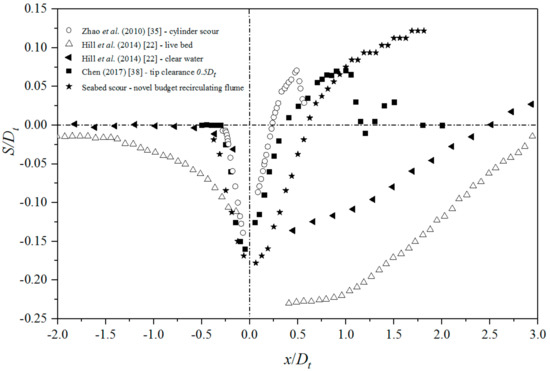 Our tidal turbine-induced scour profile is slightly different than that of Hill et al. [22] in both clear water and live bed sediment transport experiments. It should be noted that the turbine was only submerged at 0.5 Dt in the Hill et al. [22], and the tidal turbine was submerged at 2 Dt in this work. The difference in position of the submerged turbine caused the different scour depths due to the influence of the free water surface. Hill et al. [22] indicated that their mean water surface elevations indicated a maximum peak-to-trough oscillation at the rotor location of approximately 2–3% of the flow depth with the turbine effect on the free surface. The oscillation of the free surface led to the length extension of the seabed scour pit. The maximum seabed scour depth in live-bed conditions (Hill et al. [22] had a scour depth of S = 0.24 Dt) is usually deeper than that of clear water scouring (novel recirculating flume scour depth, S = 0.177 Dt).