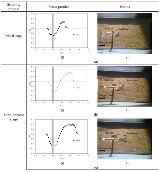 Seabed scouring is mainly caused by the obstruction of a support structure and the shadowing effect of a rotating tidal turbine. Figure 13 shows the evolution of the scouring process of tidal turbines with support structures. The vortex scale is small in the initial stage, but its effect on local scouring is obvious. This indicates that the scouring process was strong at the initial stage, and a scour pit was quickly formed around the cylinder. The sand dune was deposited at the rear of the cylinder. The experiment showed that the depth of the scour reached about 60% of the stabilisation stage in the first 15 minutes. During the development stage, the depth of the seabed scour consistently increased with time, and the width of the pit was expanded. A sharp edge was formed at the tail of sand dunes, and the height of sand dunes kept increasing. During the stabilisation stage, the depth of the sand pit was no longer changed. The shear stresses and turbulence disturbance were no longer significant to the motion of sediment particles in the scour pit. The scour depth tended to reach the limit. Though the scour pit was balanced, the sand dunes continued to move downstream. The sand dunes were continuously scoured and gradually approached the seabed as the scouring proceeded.