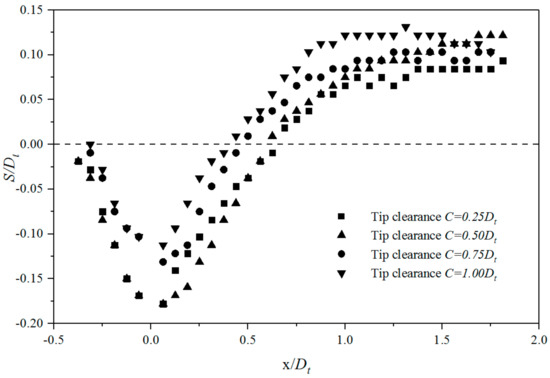 The sand dune had a reverse trend compared to the sand pit, as shown in Figure 15. The sand pit depth increased with the decreasing of the tip clearance, but the sand dune height decreased with the decreasing of the tip clearance. The decrease of sand dune height was due to the vortex formed at a lower turbine position. For the lower turbine position, a large amount of sediment was scoured from the sand pit and deposited to form sand dunes. The sediment deposited at the sand dune was further scoured downstream due to the effect of the turbine position. The upstream edge of the scour pits occurred at x/Dt = 0.35. The position of upstream edge had an insignificant difference for various tip clearances. The downstream edge of the scour pits moved further downstream with smaller tip clearances.