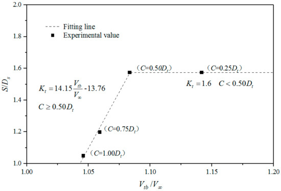 Chen and Lam [5] investigated the slipstream between the seabed and the marine current turbine via OpenFOAM. Figure 5 shows the comparison between the proposed tip-bed velocity equation and the previous works. The mass flow coefficient Cm is theoretically taken as 0.25. The tip-bed velocity is 1.46 V∞ in theory when the tip clearance is zero. Theoretical work shows the maximum increment of the tip-bed velocity is 46% of the free flow velocity due to blockage effects. The application range of the tip-bed velocity equation is for a tip clearance of more than 0.4 Dt. The maximum variation of 3.06% occurred at 0.4 Dt for the tip clearance in the range 0.4–1.0 Dt, as shown in Table 1.