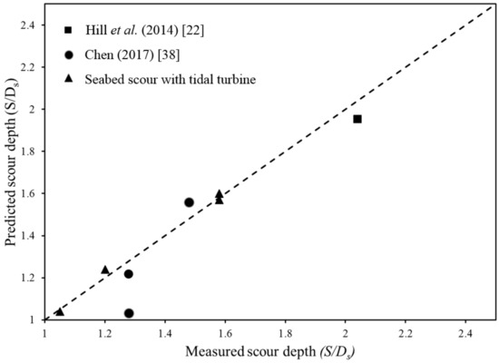 The predicted scour from the proposed equation fits well with the experimental data from the results of the statistical functions in Table 7. Berusers et al. [8], Richardson et al. [10], and Raaijmakers and Rudolph [39] improved Neil’s cylindrical scour equation [7] with a consideration of water depth, flow angle, seabed conditions, and the size of bed material. The turbine coefficient Kt can also be included in other cylinder scour equations (Berusers et al. [8], Richardson et al. [10], and Raaijmakers and Rudolph [39]) to estimate turbine scour.