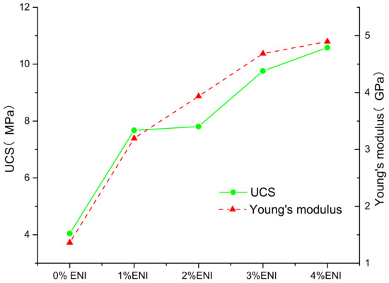 The UCS and Young’s modulus values (shown in Figure 3) of samples under the different concentrations of ENI were obtained through analysis and calculation. These results were based on the linear part of curve in Figure 2.