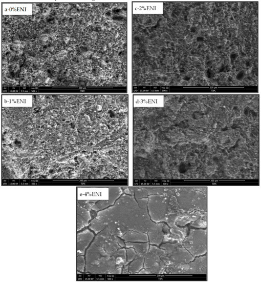 Other square samples (length 15 × wide 10 × height 5 mm) were immersed in different concentrations of ENI for 24 hours. Then the surface morphology of samples was analyzed by SEM images. SEM images are first chosen to address scaling issues when choosing samples for 2D and 3D volumetric analysis. The images’ microstructural information is indicated in Figure 4.