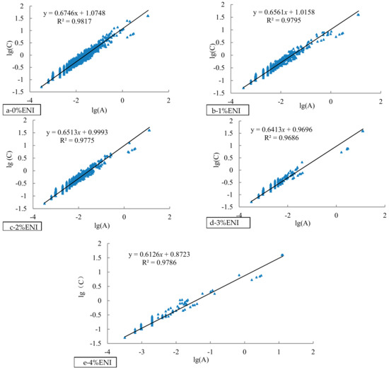 It can be observed from Figure 5 that lg (A) and lg (C) were positively correlated, and the linear correlation between parameters is good. The judgment coefficient R2 belongs to 0.9686~0.9817, so the fitting goodness is very high. Therefore, the fractal dimension can be derived from the calculation of the fitted curve. The fractal dimension of the sample could be obtained in Table 3.