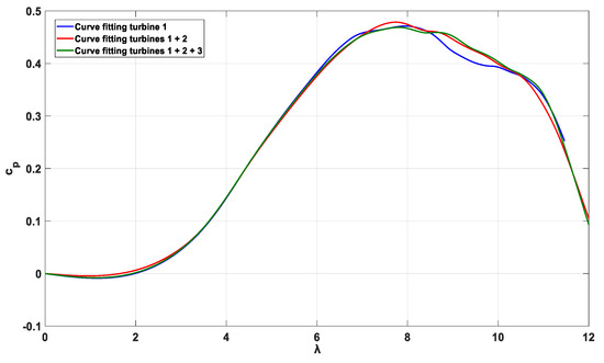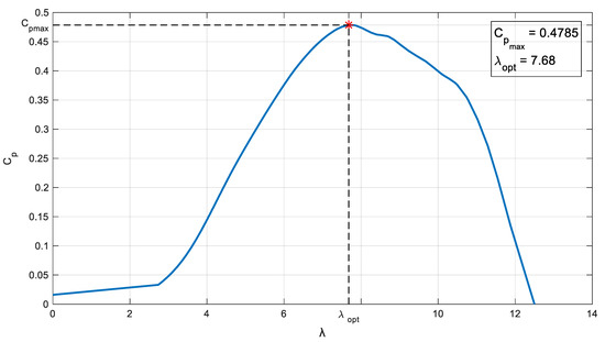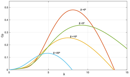 Figure 2 shows a set of - curves for different values of , obtained using a non-lineal function [22]. Each curve has a different maximum power coefficient value, , at a different value (denoted as optimal lambda or ).