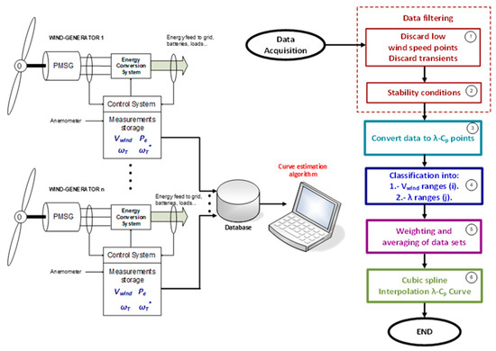 Data is collected from three different small wind turbines, as part of three different off-grid systems. The presented results correspond to a two-month period of data recording. For data collection purposes, the control system of the turbine is modified to perform a speed reference () sweep in a loop, varying from 90 rpm to 562.5 rpm ( with a 10 rpm increment every 30 min. Meanwhile, the system is sampling, every second, the three magnitudes needed to obtain the - points (, , and ). To maintain constant, the electronic converter connected in the AC output of the PMSG must be able to extract all the generated electrical power. A controlled resistive load is used to extract the excess of power that the loads are not demanding. The data collection algorithm considers safety issues, resetting the speed reference to if the incoming torque exceeds a generator torque threshold that is set to 90% of the rated torque during the data recording. This limitation ensures that the maximum electrical torque of the generator is not exceeded, and the system can still be controlled. For every value, the system collects a huge amount of data that has to be filtered to discard non-significant values. Figure 3 depicts the block diagram of the acquisition system and the flowchart of the proposed algorithm for the estimation of the - characteristic curve.
