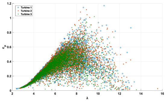 After the filtering process, the remaining sets of values of , , and are processed to obtain the corresponding - coordinates. It is important to notice that the altitude has been considered to correct for air density when values are calculated. Figure 4 shows the - coordinates obtained after the filtering process. The points corresponding to each turbine are shown with different colors and symbols.