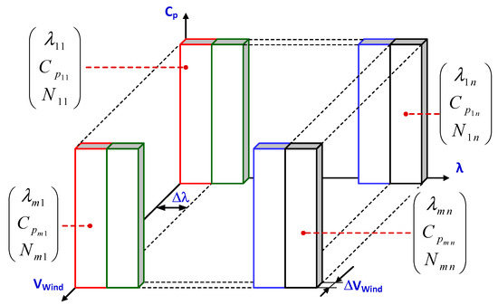 The obtained - points are classified firstly in ranges, being denoted by subscript m in Figure 5. These ranges are selected in this study with = 0.5 m/s, with acceptable values between 3 m/s (the cut-in speed of the turbine) to 16 m/s (m = 1…26). The points corresponding to each range are classified again, this time in ranges of , being denoted by subscript n in Figure 5. These ranges are selected to give enough resolution to the curve, Δ = 0.1 being used in the experimental analysis, with a for the turbines and locations used in the study. The three-dimensional space defined by -- is divided in m by n cuboids, as appears in Figure 5. A cuboid that contains less than five points is discarded because they are non-representative points of the - curve.