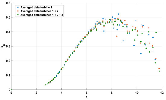 Figure 6 shows the averaged and weighted points obtained for three aggregation cases: using the data from turbine 1 (blue), merging the data from turbines 1 and 2 (red), and using the combined data from the three turbines (green).
