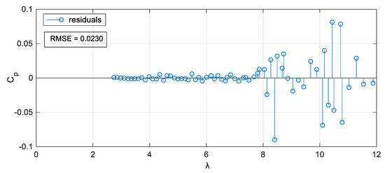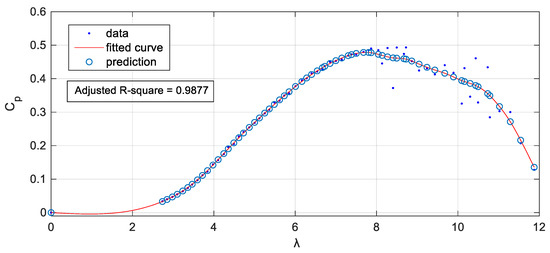 The resulting - points obtained for this set of turbines are shown as blue dots in Figure 7. It can be seen that the maximum never exceeds 0.5, which is always below the Betz limit. Distribution of points until reaching is quite uniform, with a greater dispersion for .