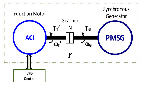 The mechanical model of the proposed emulator is shown in Figure 11, where is the torque delivered by the induction motor that is emulating the turbine operation, is the gear ratio of the gearbox, and is the moment of inertia of the mechanical system including the induction motor (IM block), the gearbox, and the PMSG generator. The emulator is implemented with the same PMSG generator used in the wind turbines used to obtain the - curve.