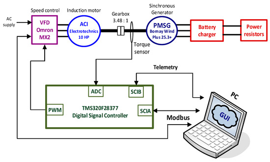 The VFD drive implements a sensorless speed control. The speed reference of the VFD drive is proportional to the frequency of a pulse train applied to an input equipped with a capture module. The induction motor and the PMSG are linked by a gearbox with a gear ratio . The PMSG is part of the Bornay Wind Plus 25.3+ small wind turbine and its main characteristics have been described in a previous section. The energy generated by the PMSG must be dissipated by an intelligent load that can be controlled to set different loading situations.