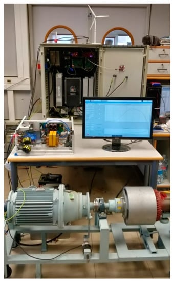Several implementations of wind emulators are detailed in References [11,12,13,14,15,16,17,18,19,20,21]. Wind emulators are classified mainly according to the type of electromechanical actuator used, or by the parameters considered for the implementation of the aerodynamic model. DC motors can be used as electromechanical actuators [11,12,13,14,15] because of their easy torque control through the armature current. However, DC motors present some important drawbacks such as: considerable size-power ratio, high cost, the need for maintenance, etc. [15]. Other electromechanical actuators use induction motors [16,17,18,19], permanent magnet synchronous motors (PMSM) [20], or servomotors [21]. The effect of the variation of wind speed with height, known as wind shear, is included into the aerodynamic model of the turbine in Reference [20]. Other phenomena, such as the tower shadow effect (which occurs every time one of the blades passes in front of the tower) are also integrated into the turbine model in References [19,20]. A servomotor controlled by an inverter is used in Reference [21]. The inverter control signal is calculated using the generated wind torque feedback signal and the desired wind speed in the aerodynamic model. A wind system connected to the grid is simulated in Reference [19], using an induction motor as actuator. The torque to be developed by the actuator is calculated based on the wind speed and considering the tower shadow effect. Wind profiles are obtained offline by means of an anemometer located on the roof of the laboratory.