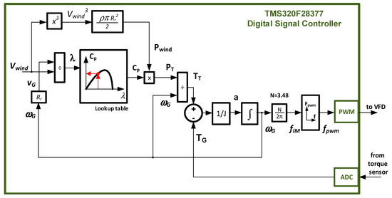 The main control of the turbine emulator system is made by a Texas Instruments TMS320F28377 digital signal controller (DSC). Based on the mechanical model, the inertia to be simulated, and the - curve obtained in the previous section, the DSC determines the speed reference of the induction motor. The block diagram of the algorithm implemented in the DSC is depicted in Figure 15. The block diagram implemented corresponds to a directly coupled small wind turbine, so Equation (2) is used and the gear ratio N is added after is calculated.