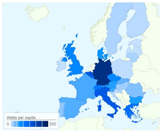 Penetration of solar PV systems in 2018, in Watts per Capita (own illustration).