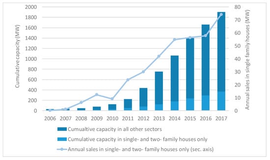 Annual sales (right axis), the cumulative installed capacity of solar PV in single- and two-family houses and comparison with the total cumulative installed capacity of solar PV (left axis) in Switzerland (own illustration based on [6]).