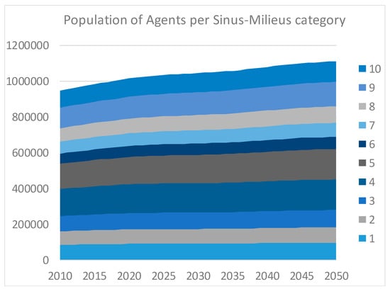 Because the social network is dynamic over time (since people’s preferences may change with the age, and the growth of income may alter lifestyles and the socioeconomic status), we apply the trends in the allocation of the population to the Swiss Sinus-Milieus® socioeconomic categories from 2005 [50] to 2016 [51] to approximate changes in the social and lifestyle preferences until 2050. Figure 5 presents the classification of agents into the different Sinus-Milieus® categories over time.
