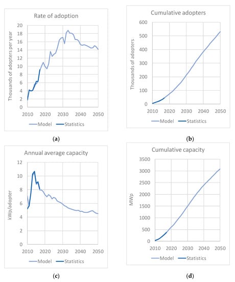 The parametrization of the model is given in Appendix B. The validation of the model against the statistics throughout 2010–2017 resulted in 0.6% error in the cumulative adopters (sales) and 1.3% error in the cumulative installed capacity.