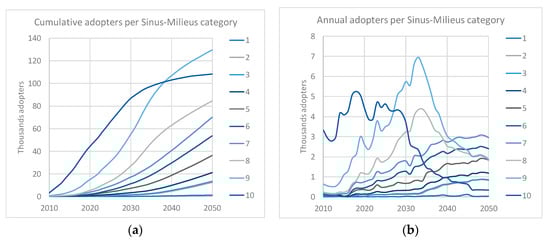 Cumulative adopters (a) and annual adopters (b) per Sinus-Milieus® category; for a mapping to the IDs reported in the figure to the Sinus-Milieus® category, please see Table 1.