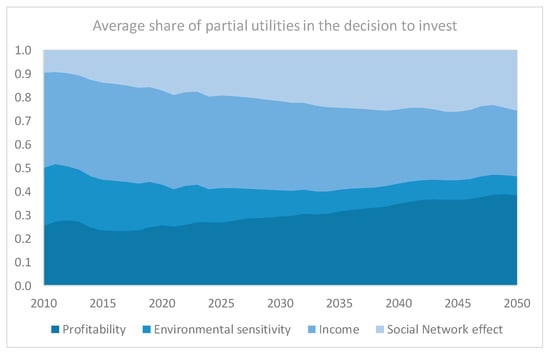 Figure 8 presents the share of each partial utility in the total utility of agents that have installed a solar PV system, which is a key component of the innovation-decision mechanism of the model. In the near-term period until 2030, the decision to invest in solar PV technology is mostly influenced by the level of agent’s income and the profitability of the investment. In this regard, the financial support schemes, implemented by the government, play an important role. The environmental sensitivity and level of knowledge and awareness about the PV technology also have a significant weight in the adoption decision in the near-term period, driven by the ecological values of the innovators and early adopters.
