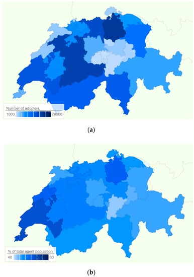 Geographical distribution of adopters; (a) number of adopters per Canton; (b) the percentage of adopters in total agents.