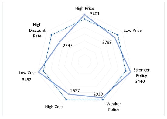 Overview of the installed solar PV capacity in single-family houses by 2050 (MW), according to different policy schemes, electricity price levels, specific investment cost, and discount rates, compared to the “Reference” scenario (dotted line).