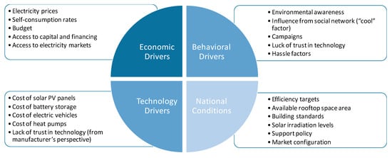 Low electricity prices and low self-consumption ratios are among the economic drivers that can limit the penetration of solar PV in single- and two-family houses and consequently, the uptake of the prosumers in this market segment. On the other hand, high electricity prices, high self-consumption ratios, and easy access to capital are considered to be favorable economic drivers for the diffusion of the solar PV systems.