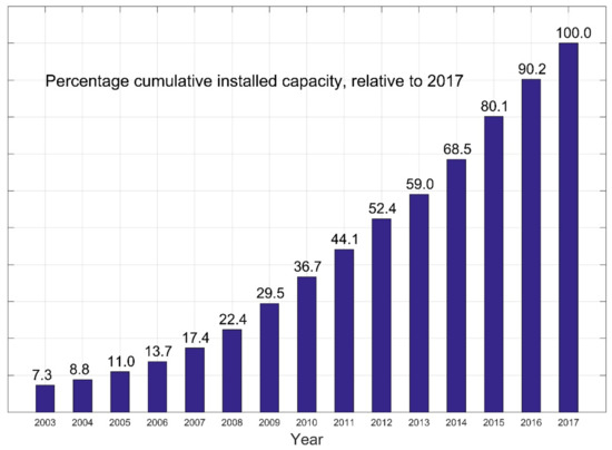 Wind energy has become an increasingly competitive source of electricity, not only among renewable energy sources but also compared with conventional fossil fuels [1]. The global cumulative installed wind capacity exceeded 539 GW by the end of 2017 [2]. Wind power represents about 6% of the global electricity capacity and more than 3% of the global electricity generation of all energy sources [3,4]. Among renewable energy sources, wind energy capacity is more than half the global renewable installed capacity (not including hydropower) [1], it also shares more than half the growth [5]. Wind energy is also the second highest growing renewable energy source (after solar photovoltaics) [1,5]. The 2003–2017 global cumulative installed wind capacity [2] was normalized as a percentage of the 2017 value and presented in Figure 1.