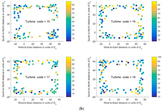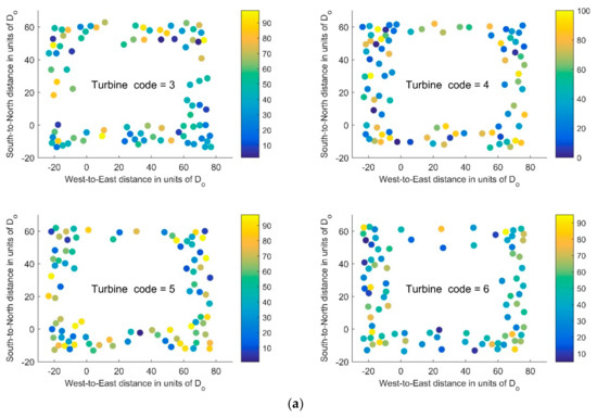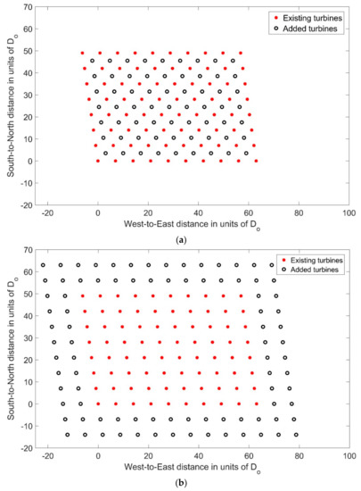 The external unstructured upgrade was investigated by considering the same area and the same number of added turbines as the external grid but with an unstructured (non-grid) layout. The minimum turbine proximity was set as 3.5 Do, where Do is the diameter of the original turbines (80 m). In all cases, Vestas turbines were considered as this manufacturer’s turbines were used in the original farm. The number of turbines in the original farm is denoted N (N = 80), while M is the number of extra turbines (M = 63 for the internal grid layout and 68 for both external layouts). In all cases, the existing turbines were numbered from 1 to N, while the added turbines from N + 1 to N + M. The vertical coordinate in Figure 3 indicates the North direction and the values in both vertical and horizontal scales are in multiples of Do.