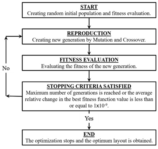 Layout optimization for large wind farms with commercial turbine selection is discrete, non-convex, non-linear, and of high dimension. Genetic Algorithms (GAs) are of the most successful optimization methods for such complex optimization problems. The capability of GAs has been proven over years, especially with WFLO, e.g., [47]. On the other hand, GAs are computationally expensive compared with other optimization methods, e.g., [29,47,48], as they require successive random searches. The solution evolves from one generation of a fixed population size (PS) to the next generation. In general, the larger the PS, the wider the search, and the greater the probability of finding the global optima. However, a very large PS requires large execution time without significant improvement on the solution, e.g., [49]. Accordingly, it is very important to select the proper PS in order to increase the probability of finding the global optima while keeping the execution time reasonable, e.g., [49]. Following the majority of the WFLO studies and recommendations found in the literature, GA was used in the present work. Figure 5 shows a flowchart for GA procedure.