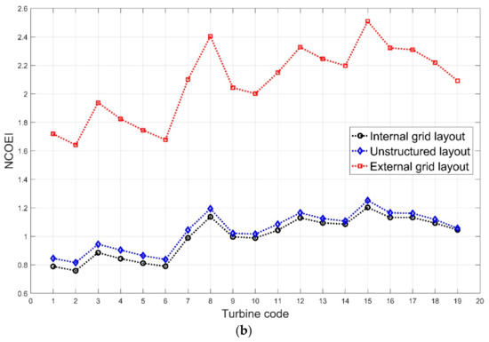 The results for the three cases are discussed in detail in this section. AEP and the TCI were normalized by the corresponding values for the original farm, AEPO and TCIO, respectively. The two normalized quantities were denoted NAEP = AEP / AEPO and NTCI = TCI / TCIO. Moreover, the NTCI were divided by the NAEP, to give the Normalized Cost Of Energy Index, NCOEI. The NAEP and NTCI are useful in comparing different layouts and arrangements qualitatively relative to the original farm’s AEP and TCI, respectively. Finally, NCOEI helps in depicting and comparing their feasibility.