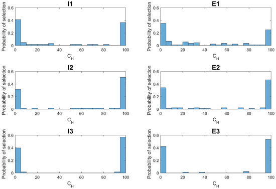 Figure 8 shows the NAEP, NTCI, and NCOEI for the single turbine cases and ObjFun1. Moreover, the probability of selection for CH values for all single turbine cases is given in Figure 9. In these cases, the M added turbines were assumed identical in type, but different in height. It is important to note here that the discrete points in Figure 8 were connected with dotted line for visual aid only. The major findings are summarized as: