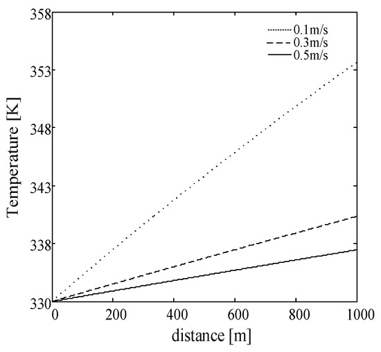 In fact, the temperature distribution of the oil pipeline is greatly affected by the parameters of the pipeline type, the depth of the pipeline, the initial temperature of the pipeline, the oil volume per unit time, the viscosity of the crude oil, the seabed temperature, and the pressure environment. Therefore, it is difficult to accurately represent the temperature distribution of the pipeline with a set of data and a curve. What is studied in this paper is not the exact value of the temperature distribution of the heavy oil pipeline in the seabed, but the general law of the temperature distribution. Therefore, some representative parameters of the heavy oil pipeline in the seabed can be analyzed. For Ø219 × 7 mm pipelines, three inlet flow rates are considered: 0.1 m/s, 0.3 m/s and 0.5 m/s, and the density of the oil is 855 kg/m3, so the flow corresponding to the above three flow rates are 2.82 kg/s, 8.46 kg/s, and 14.1 kg/s, respectively. Assume that the initial temperature of the pipeline is T1 = 333 K, the ambient temperature is TA = 277 K, the specific heat capacity of oil is c = 2100 J·(K·kg)−1, and the skin effect electric tracing system is operated normally, its total heating power is 200W. The submarine pipeline temperature distribution curve with different inlet flow rates can be obtained from Equation (6), as shown in Figure 1.