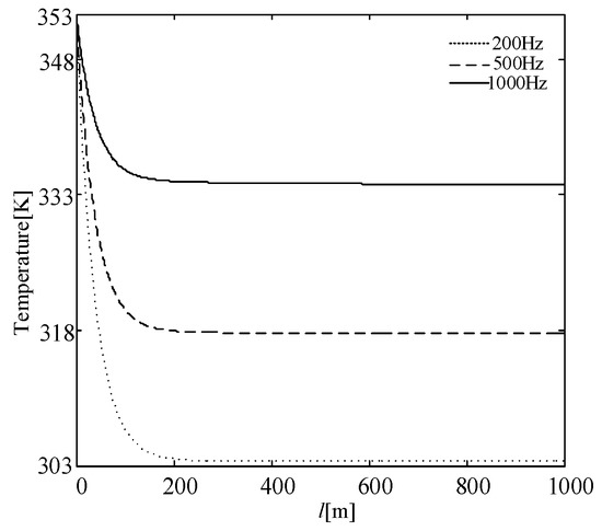 The variable P is the heating power of each segment of the skin effect electric heat tracing system, and P0 is the heating power of the heating cable and the heat tracing pipe section at the heavy oil outlet. It can be seen from Figure 3 that when the current frequency is low (200 Hz), the capacitance and inductance are less, and the heat generation of the skin effect electric heating system is improved. In the case of a high current frequency (1000 Hz), the effects of capacitive reactance and inductive reactance are more and more significant, and the power of the skin effect electric heat tracing system exhibits an upward change. At this time, combined with the axial temperature distribution model of the deep-water subsea flowline and the power distribution model of the heating system, the inlet flow rate of the heavy oil is 0.5 m/s, the inlet temperature of the heavy oil is 353 K, and the ambient temperature is 277 K. When being heated by the electric heating, the actual temperature distribution curve of the deep-water submarine pipeline is shown in Figure 4.