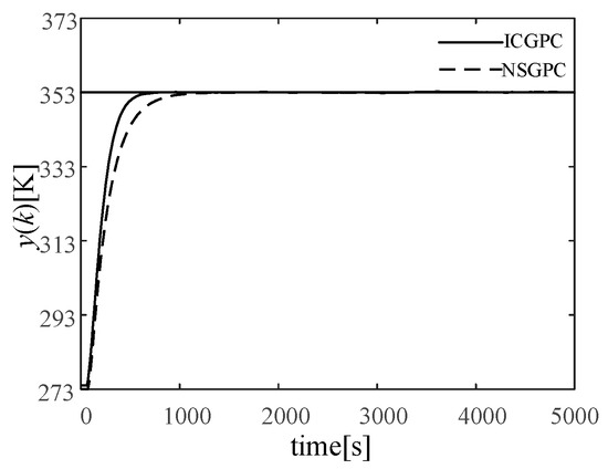 It can be seen from Figure 6 that the constrained generalized predictive control (GPC) controller designed by introducing the input softening factor method can make the system reach the set temperature of 353 K in about 500 s, the dynamic response is fast, and the system static error is reduced to almost zero after 600 s. The nonlinear generalized predictive control NSGPC using quadratic programming optimization needs to calculate the inversion of the Diophantine equation and the matrix, leading to high computation cost. Therefore, the steady state is reached in about 1000 s. It can be seen that the comparison of ICGPC and NSGPC shows that the method that relies on the input softening factor is more advantageous.