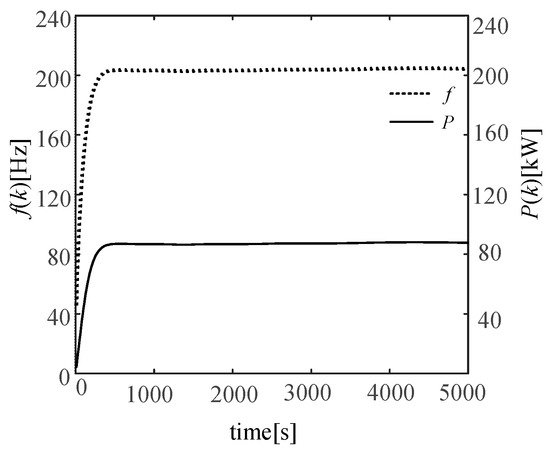 Under the action of the ICGPC, the simulation results are shown in Figure 7. The system power frequency f is represented by the dashed line, and the system intermediate variable heating power P is represented by the solid line. At the same time, it can be seen from the simulation that the system frequency is 200 Hz when the system’s heating temperature is maintained at 353 K, and the heating power required by the system is maintained at about 85 kW. Therefore, it is possible to design an intermediate frequency heating power source with a maximum heating power of 100 kW which provides a certain theoretical guidance for the design of the heating power supply for the skin effect electric heating system, thereby avoiding the drawbacks of the above parameters can only be estimated according to engineering experiments.