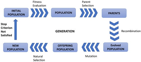 It should be noted that the full cycle as shown in Figure 1 denotes a generation; thus, the generation is an algorithmic iteration, where transition to a new iteration is initiated when the stopping criterion is not satisfied.