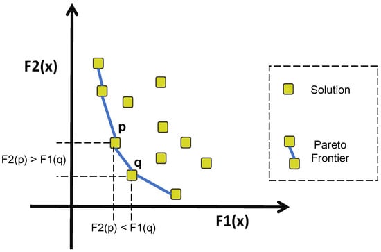 Notably, the population of Pareto solutions pertained to a specific problem can be infinite. The population of the Pareto solutions consist of the Pareto optimal set, while the projection of the Pareto optimal set on the objective space is known as the Pareto frontier []. A general illustrative example of Pareto frontier consisting of two objectives is depicted in Figure 2.