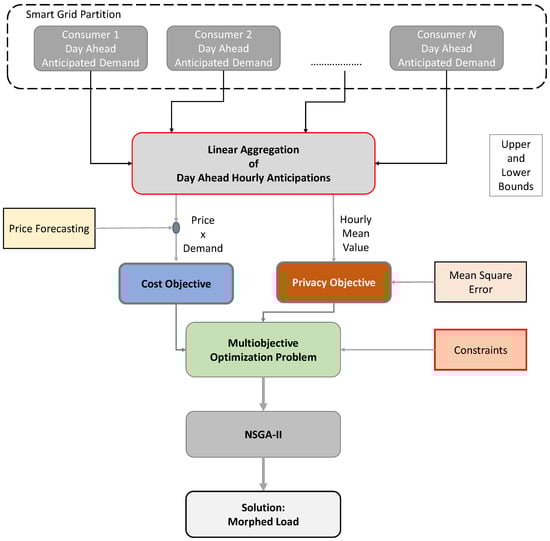 In this section, the load morphing of smart grid partitions methodology is presented. It should be noted that the way the partitions are formed in the grid is not of interest to the current manuscript. For instance, one way to form partitions is via grid partitioning as discussed in []. The methodology presented in this manuscript formulates a multi-objective problem composed of a dual of objective functions []. The two objectives, which express the consumption cost and the degree of privacy in the grid partition respectively, are minimized by seeking an optimal solution to a multi-objective problem. The NSGA-II algorithm is applied to identify an optimal solution. The block diagram of the proposed methodology is presented in Figure 3, where its individual steps are clearly provided.